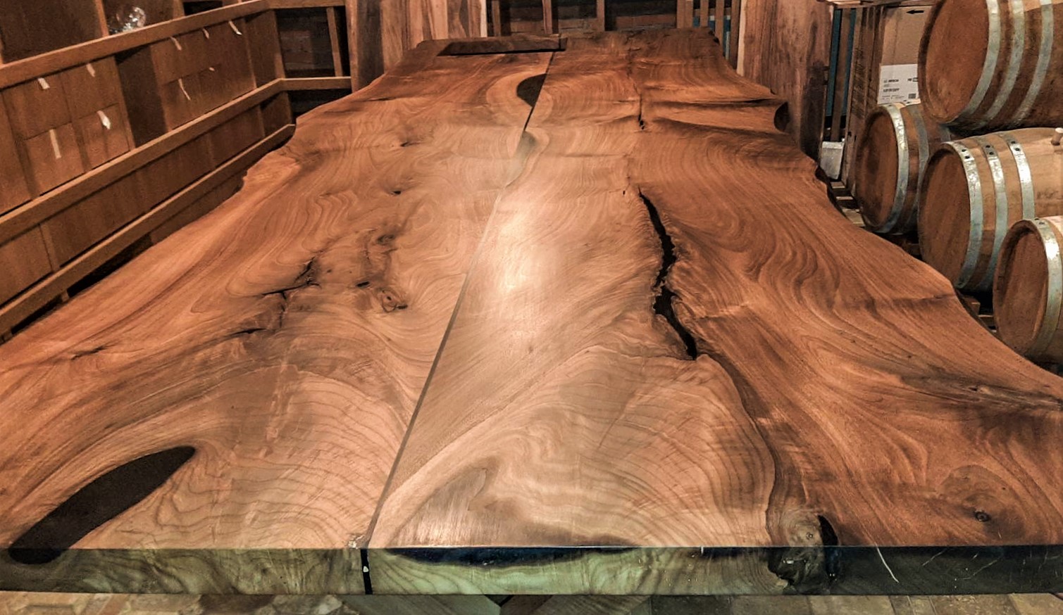 • Regal mit natürlichen Kanten aus einem Stück Walnussholz. Die Unebenheiten sind mit durchscheinendem Epoxidharz gefüllt.